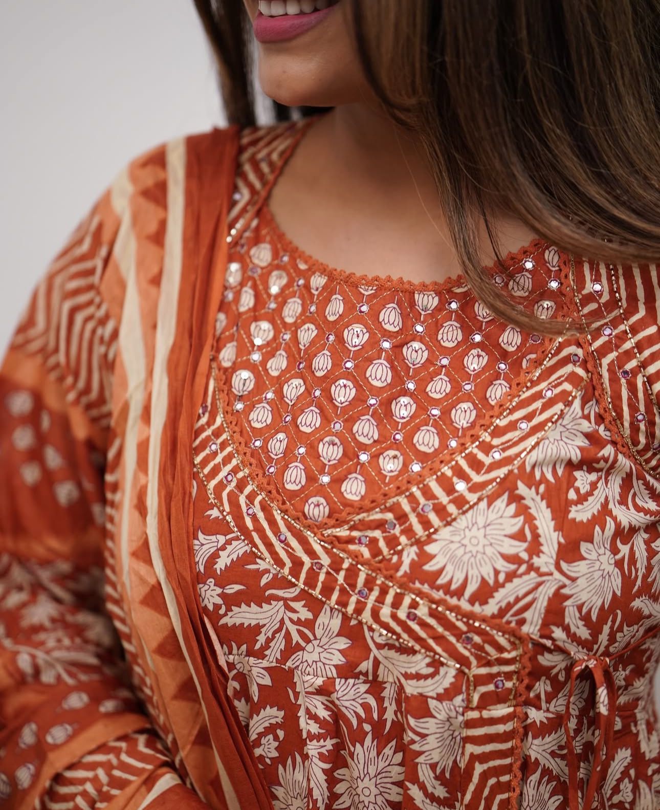 Cotton Angrakha Anarkali Kurti Set with Tagai & Kardhana Work, Printed Malmal Dupatta – 3 Piece Suit Set