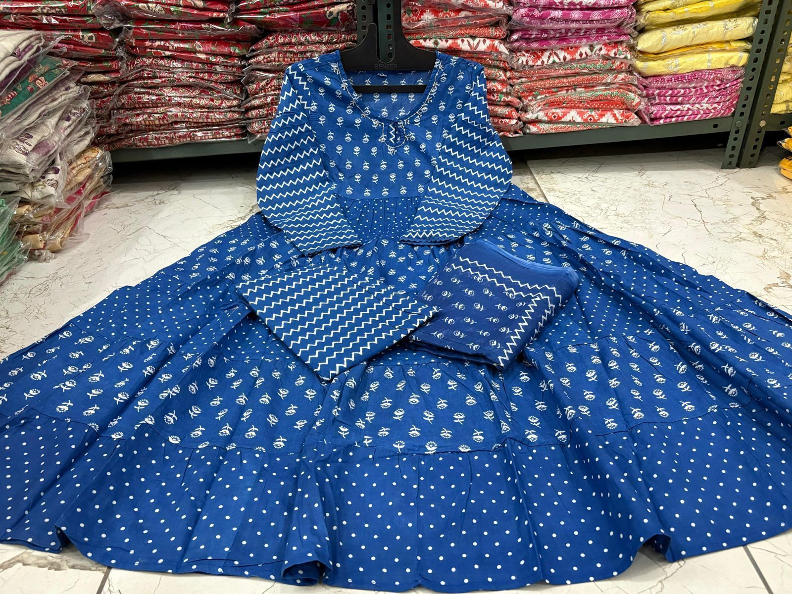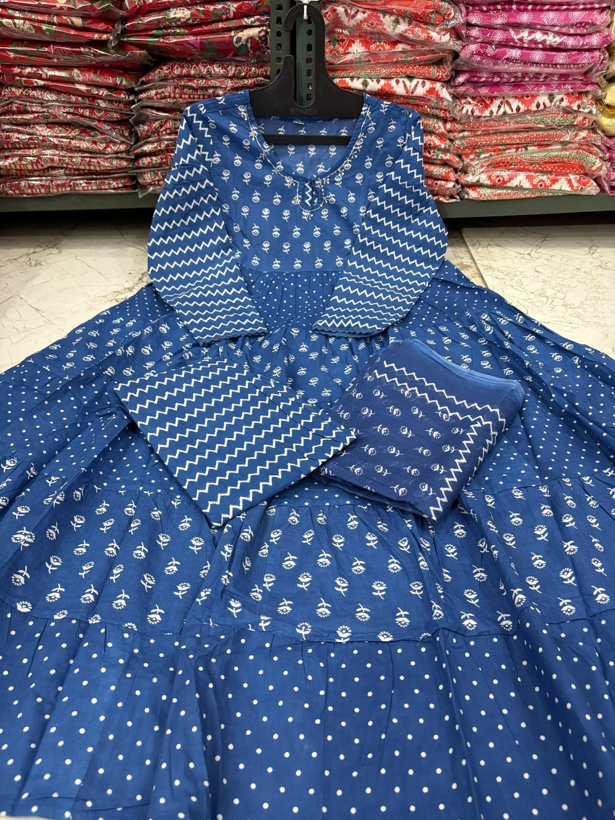 Indigo Blue Cotton Flared Anarkali Set with Dupatta & Pant