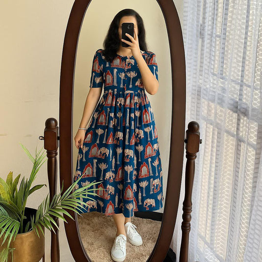 Blue Printed Lotus Flower Cotton Midi Dress