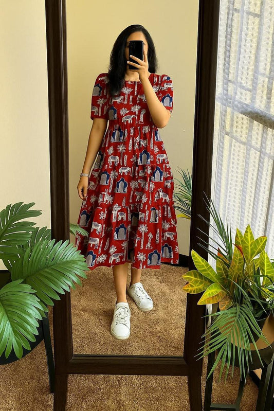 Maroon Ikat Cotton Middy Dress