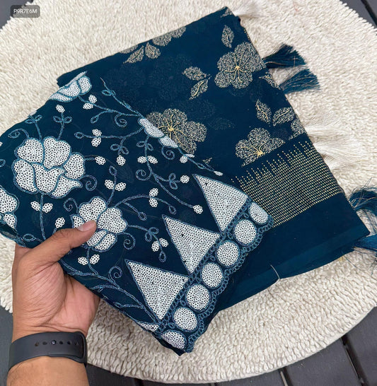 Blue 60×60 Cotton Embroidered Suit Set with Pant & Dupatta