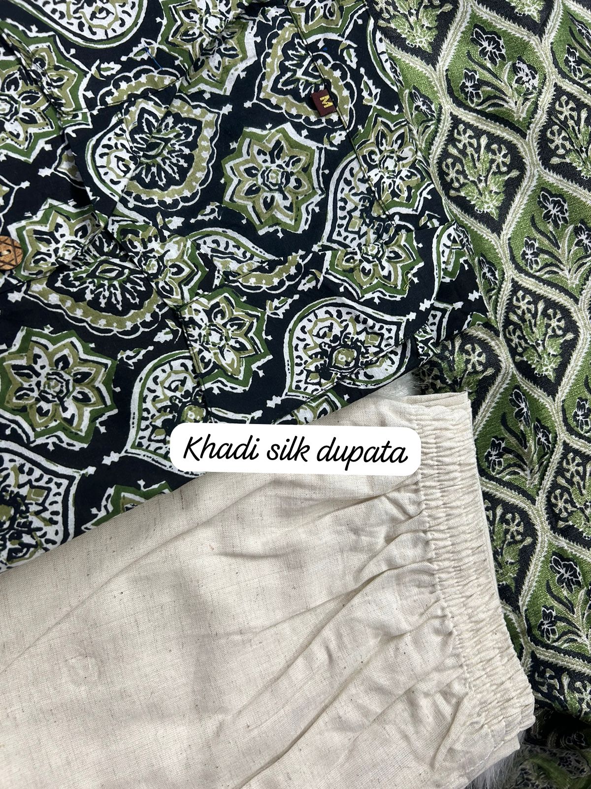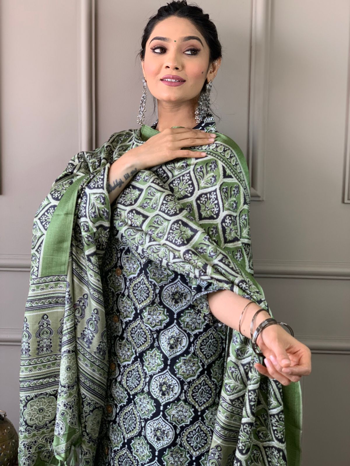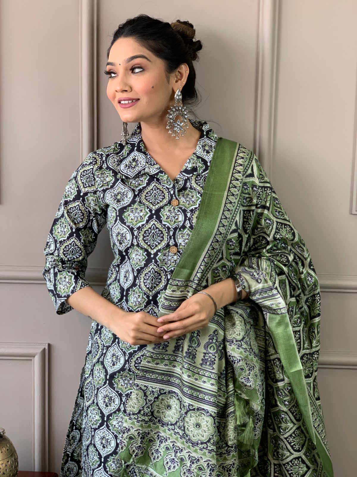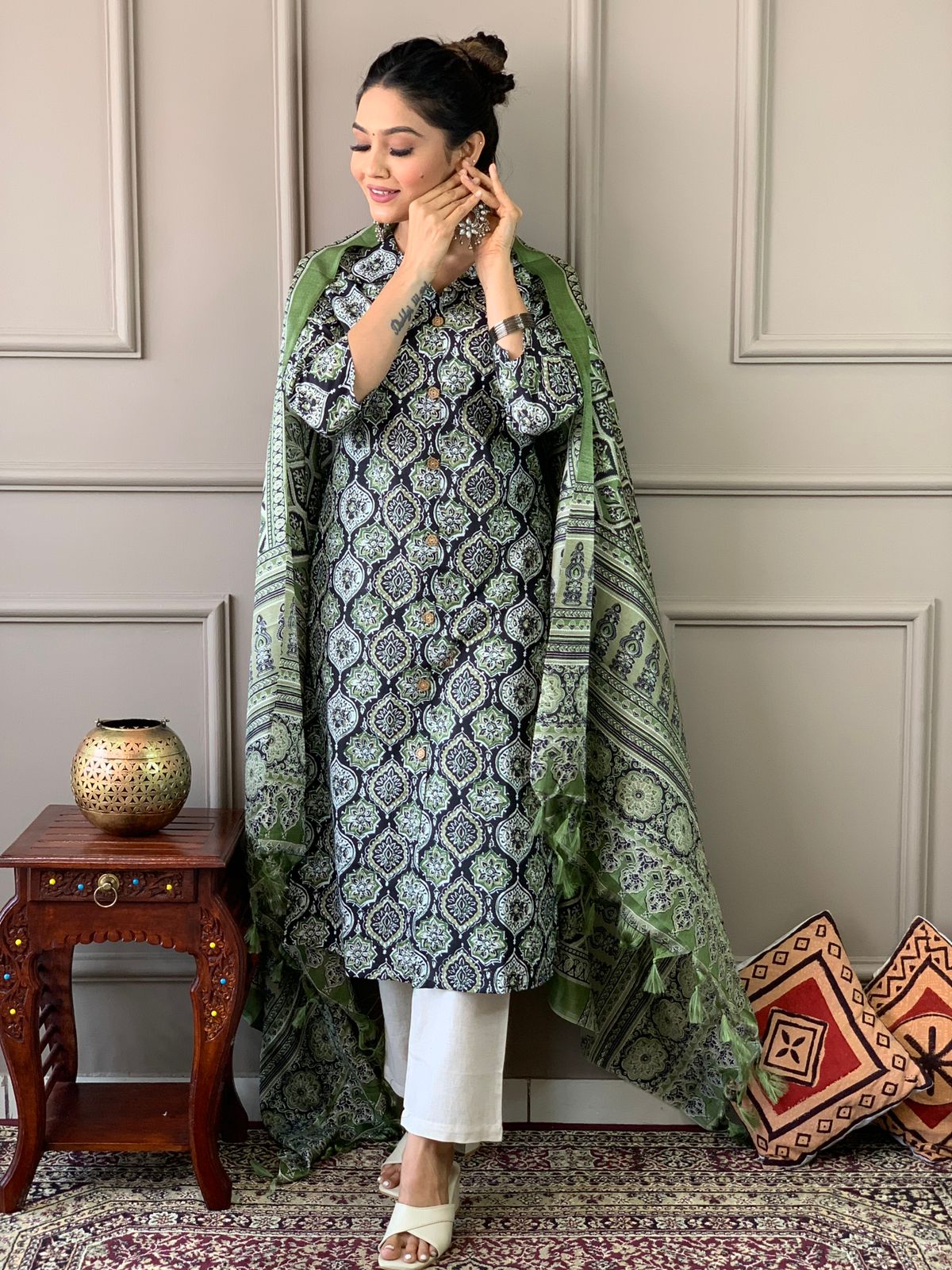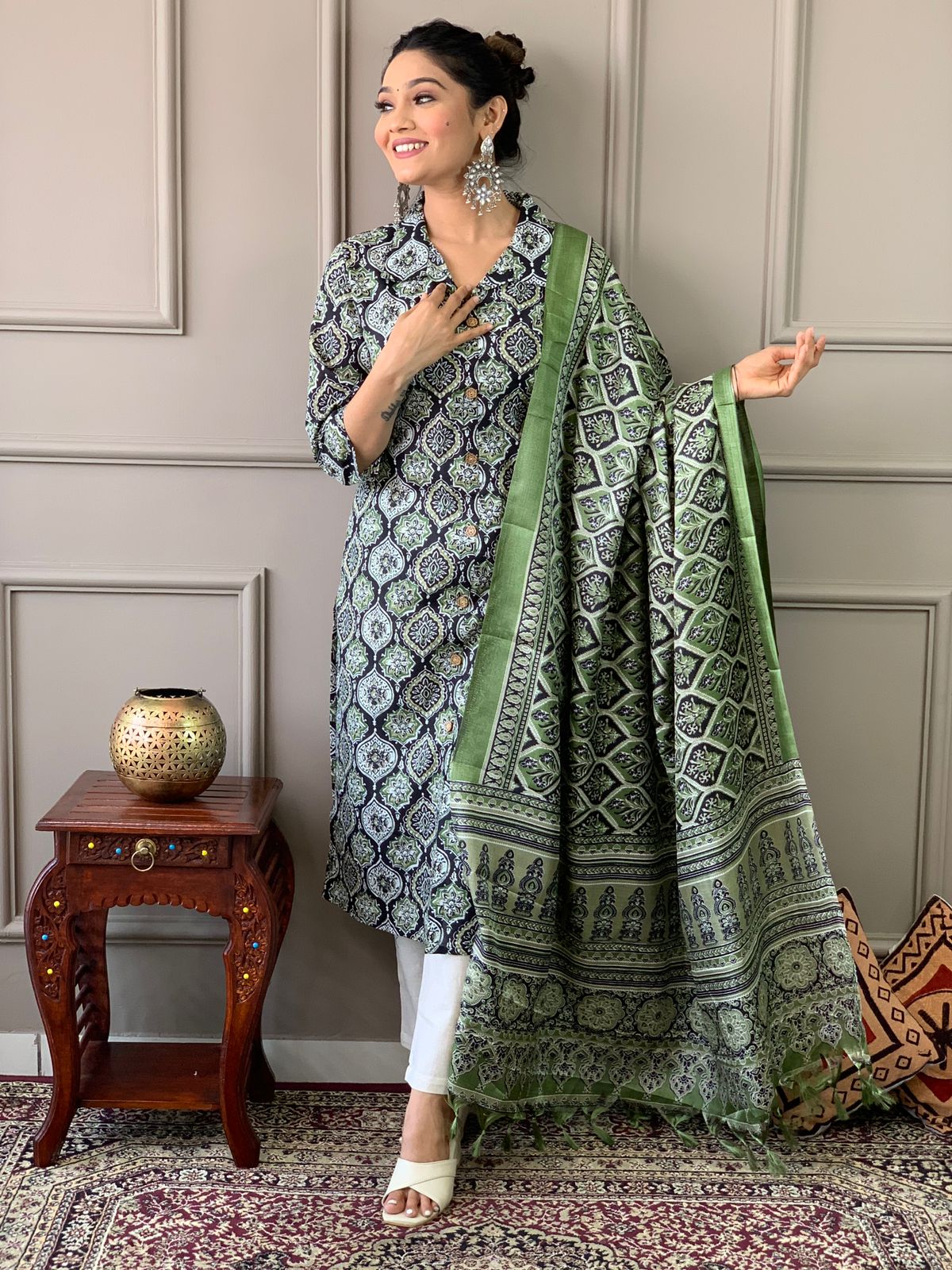 Ajrakh Work Cotton Kurta Set with Silk Dupatta