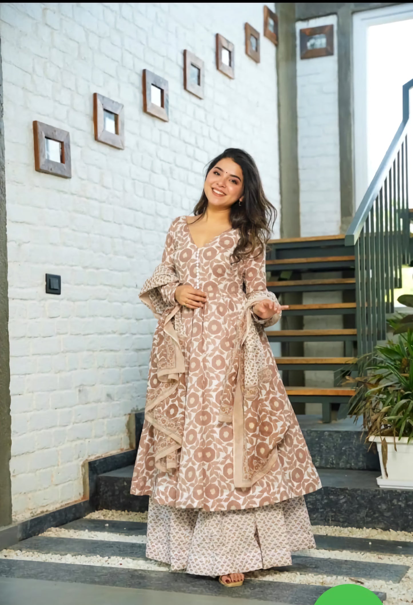 This beautiful brown Anarkali suit set is crafted from comfortable, breathable 60/60 cotton fabric. The kurti features a flattering Anarkali silhouette and a versatile look. The palazzo pant is comfortable and stylish, and the dupatta completes the ensemble. This suit set is perfect for a variety of occasions, from casual get-togethers to festive celebrations.