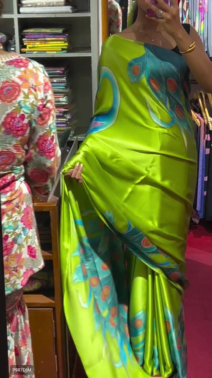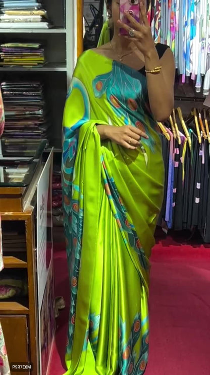 Drape yourself in elegance with this stunning satin silk saree. The smooth, lustrous fabric flows beautifully, making it a perfect choice for weddings, festive occasions, or any special event. This saree comes with an unstitched blouse piece crafted from matching satin silk, featuring an eye-catching digital print that adds a contemporary touch to this classic ensemble.