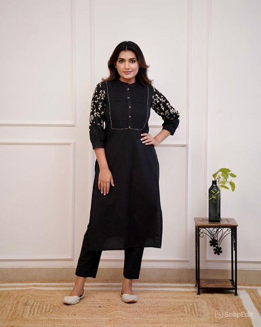 Cotton Embroidered Kurti with 2 Side Pockets & Pant Set