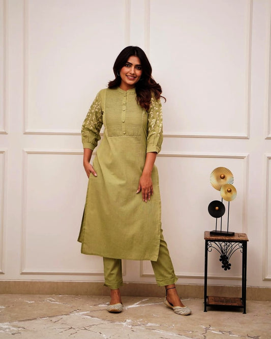 Cotton Slub Kurti Pant Set with Embroidered Pockets