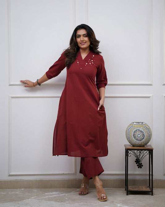 A-Line Cotton Slub Kurti Palazzo Set with Embroidery – Rust