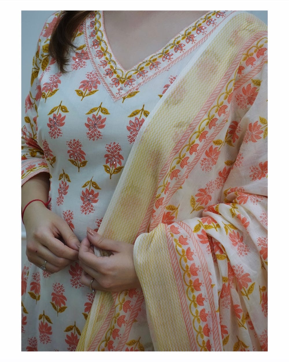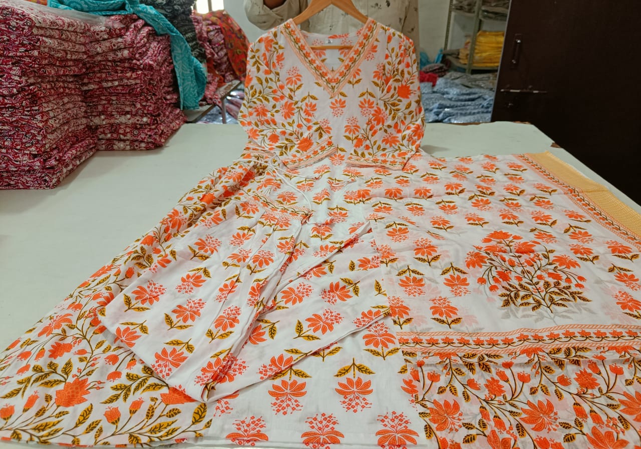 Crafted from premium cotton 60/60 fabric, the suit set embodies comfort and luxury. The intricate embroidery, meticulously adorned on the ensemble, reflects the skillful craftsmanship that goes into each piece. The delicate floral motifs weave a story of grace and charm, capturing the essence of celebration.