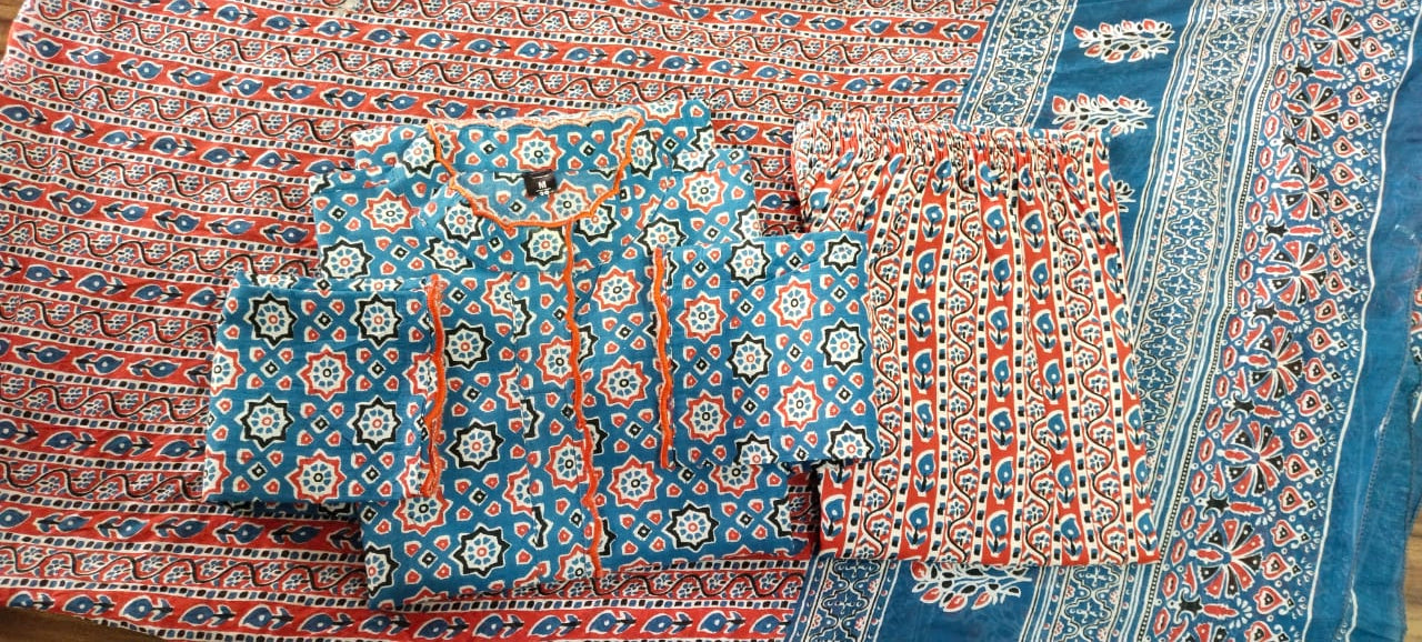 Crafted from high-quality Ajrakh printed cotton, this three-piece suit offers a seamless blend of tradition and contemporary fashion. The soft and breathable fabric ensures utmost comfort, allowing you to move freely while exuding confidence. Whether you're attending a festive occasion or a casual gathering, this ensemble is bound to make a statement.