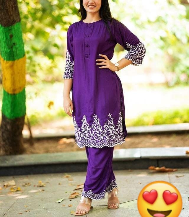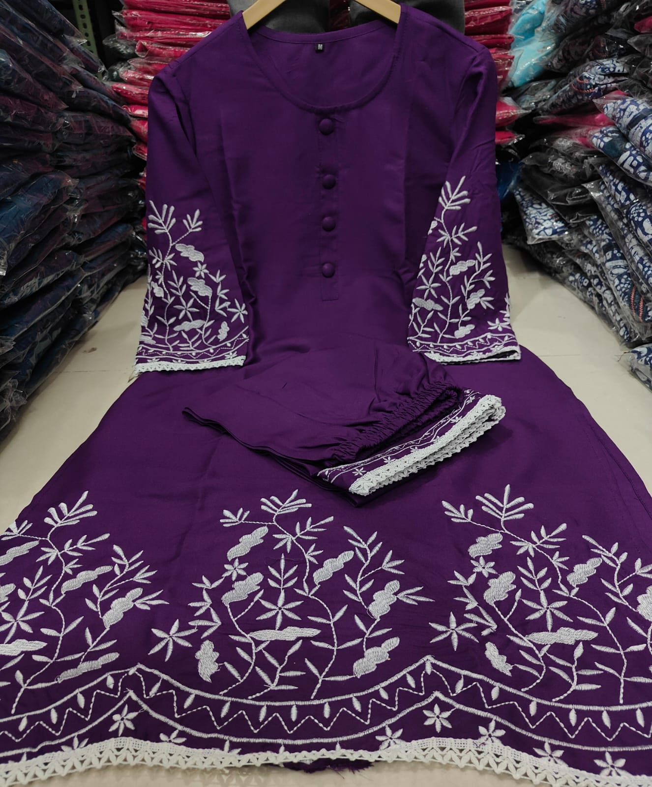 ✨ Step into sophistication with our exclusive 2-piece set crafted from luxurious rayon weighing 140 grams. The top, adorned with intricate embroidery work, exudes timeless charm and is perfectly paired with matching pant featuring delicate lace and button detailing. The fabric's lightweight yet substantial feel ensures comfort and a graceful drape. With a pant length of 38 inches and a kurti length of 40 inches, this ensemble strikes the perfect balance between style and ease. Elevate your wardrobe with this meticulously designed outfit that seamlessly blends classic craftsmanship with contemporary allure.