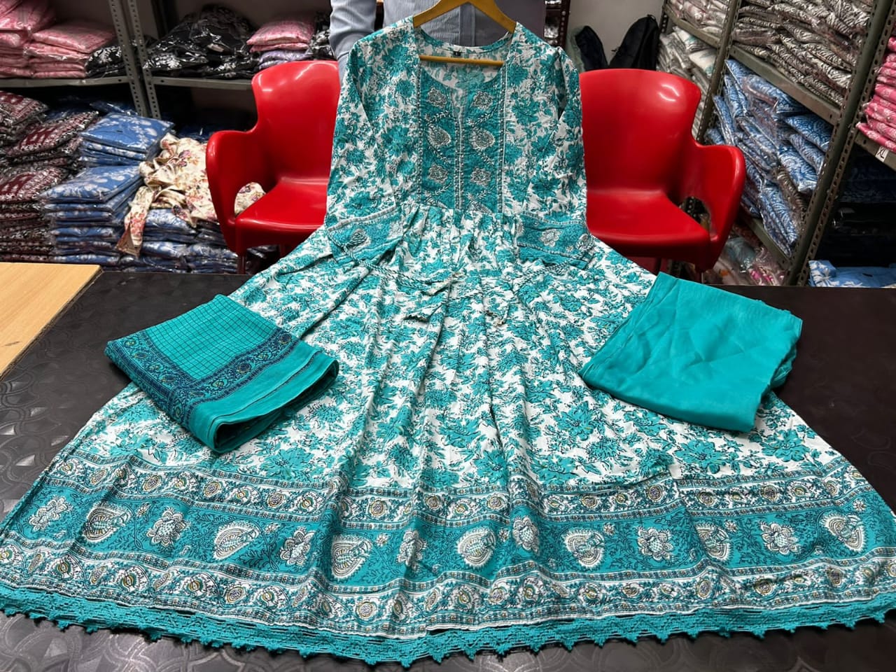 Sanganeri Print Flared Suit with Adda Work in Rayon