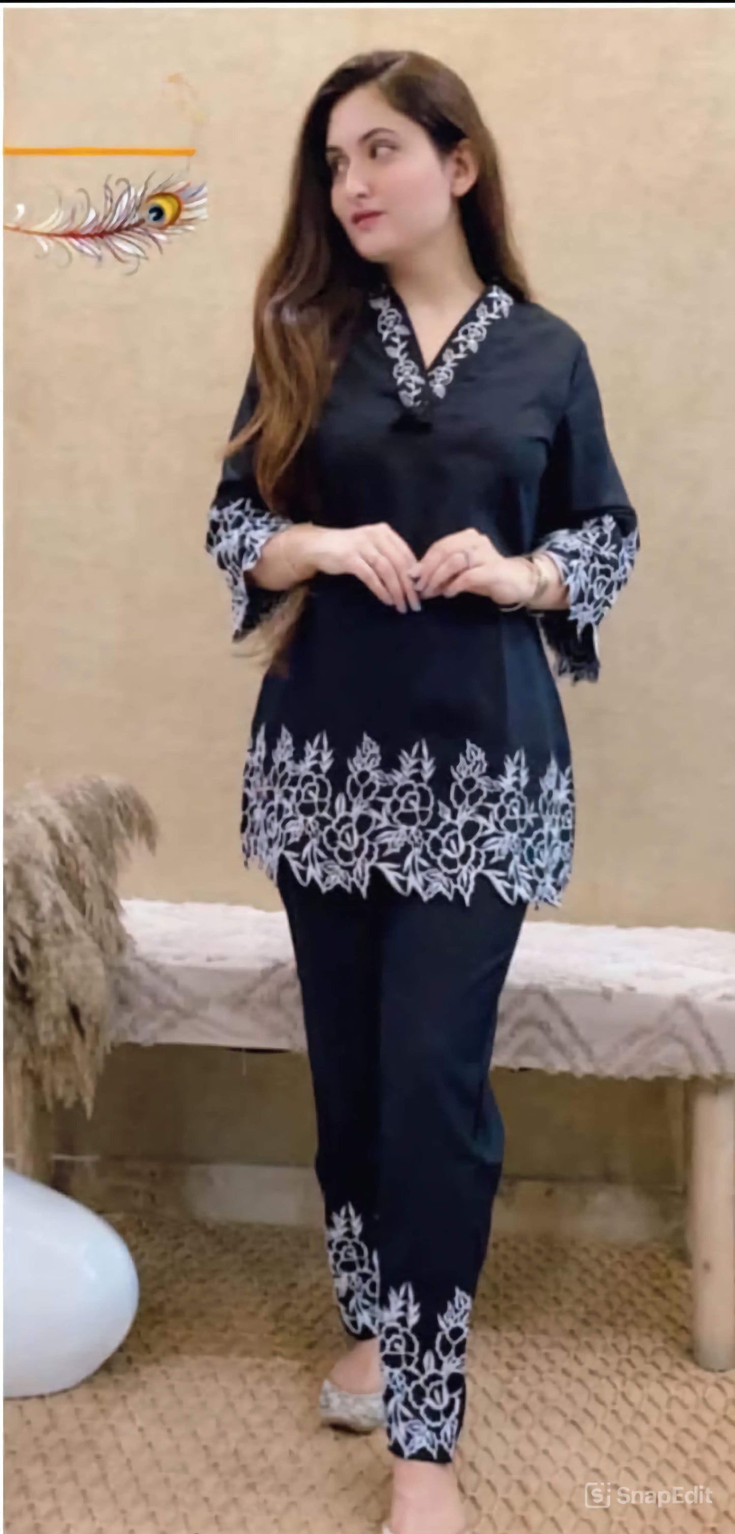 The deep black hue of this Co-Ord Set exudes sophistication, while the intricate cutwork embroidery adds a touch of artisanal craftsmanship. The matching top and bottom make it easy to create a chic, coordinated look that's perfect for any occasion.