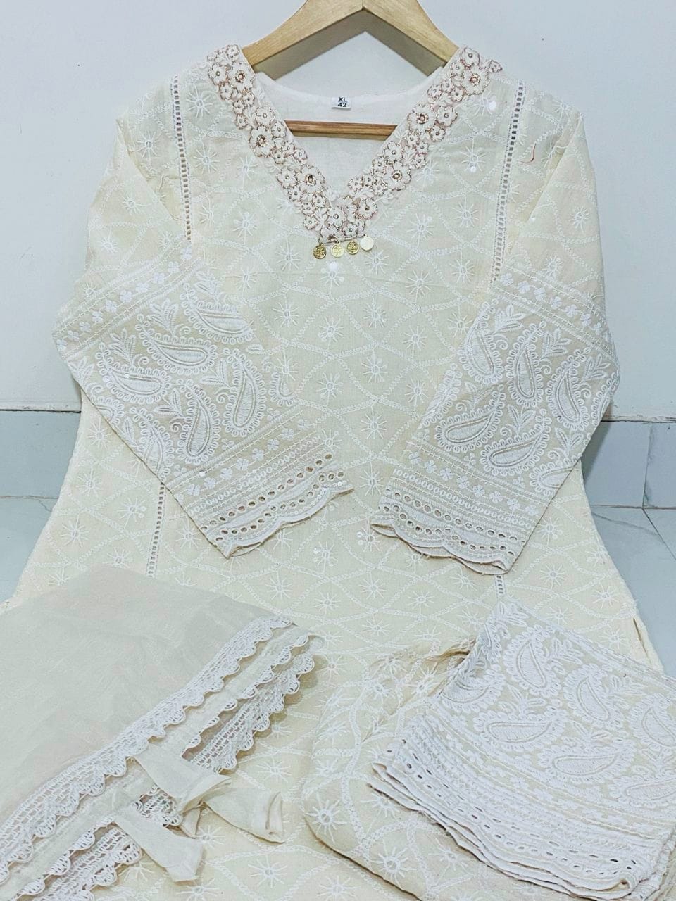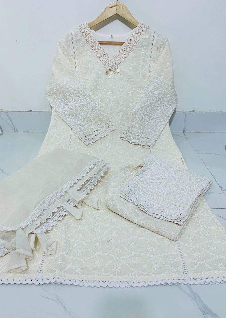 Embrace timeless elegance with this captivating Kurti Pant Dupatta set, crafted from luxurious Chickenkari fabric.