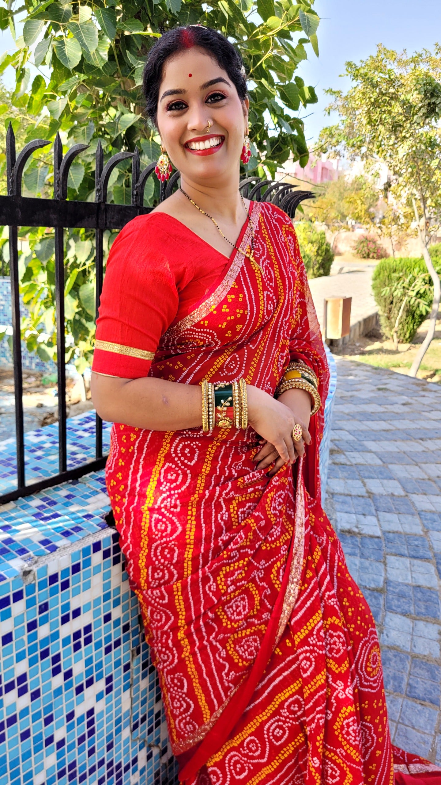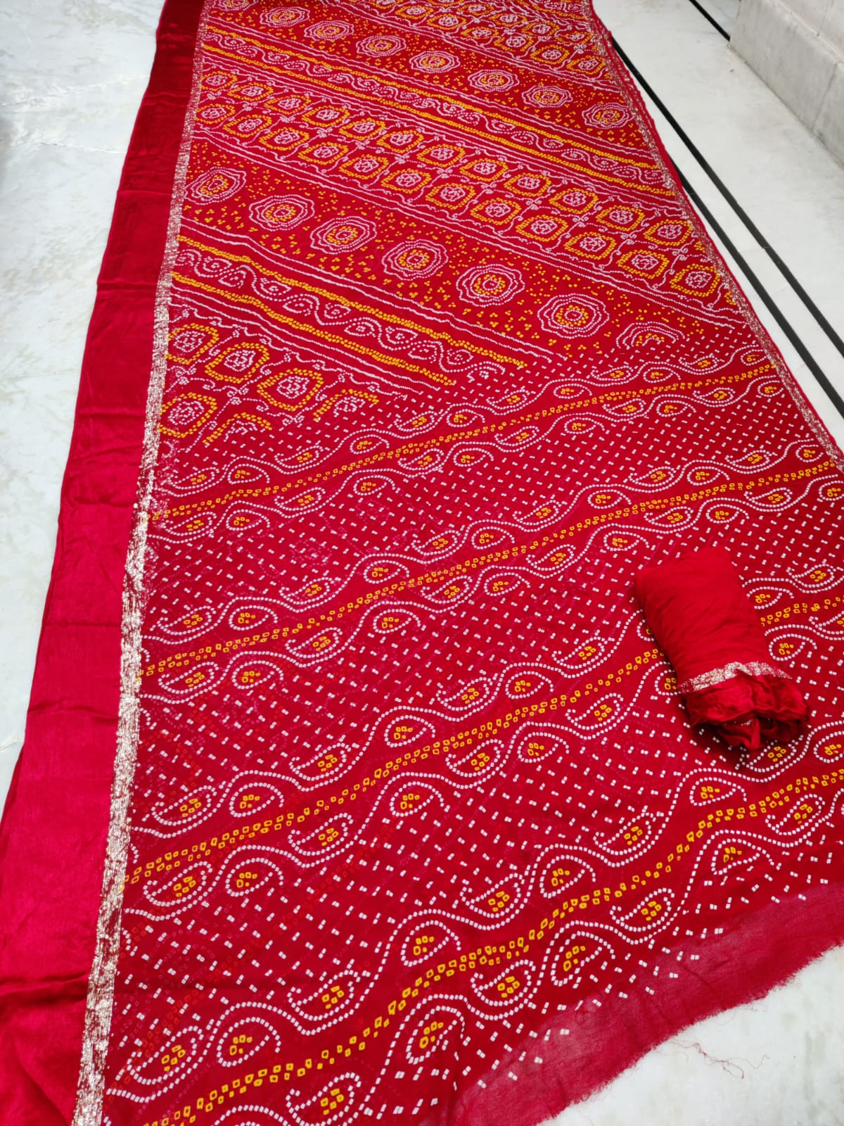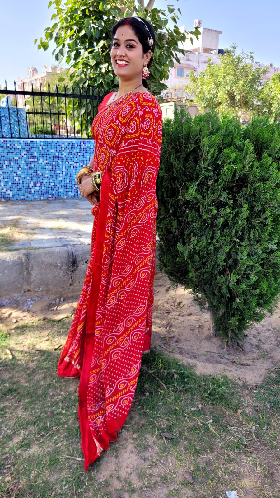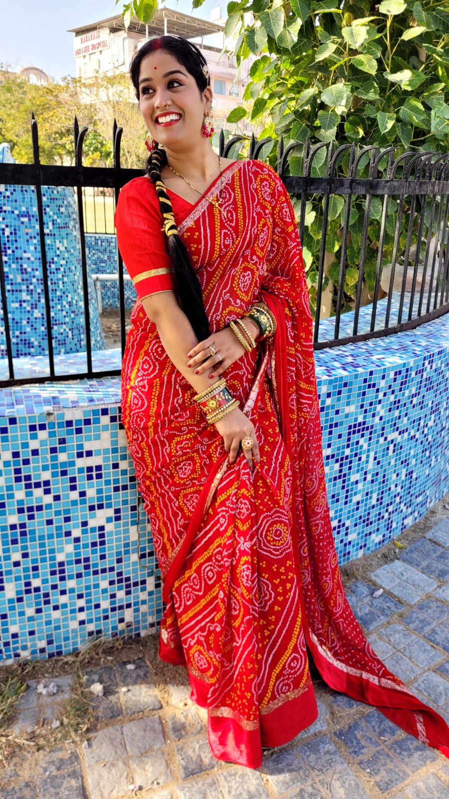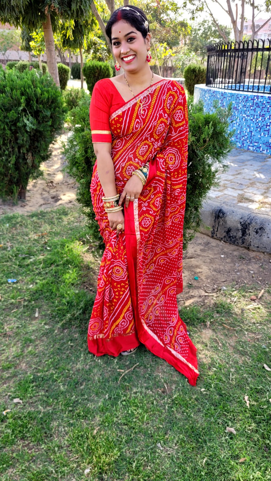 Viscose Georgette Satan Patta Saree with Bandhej Print and Contrast Blouse