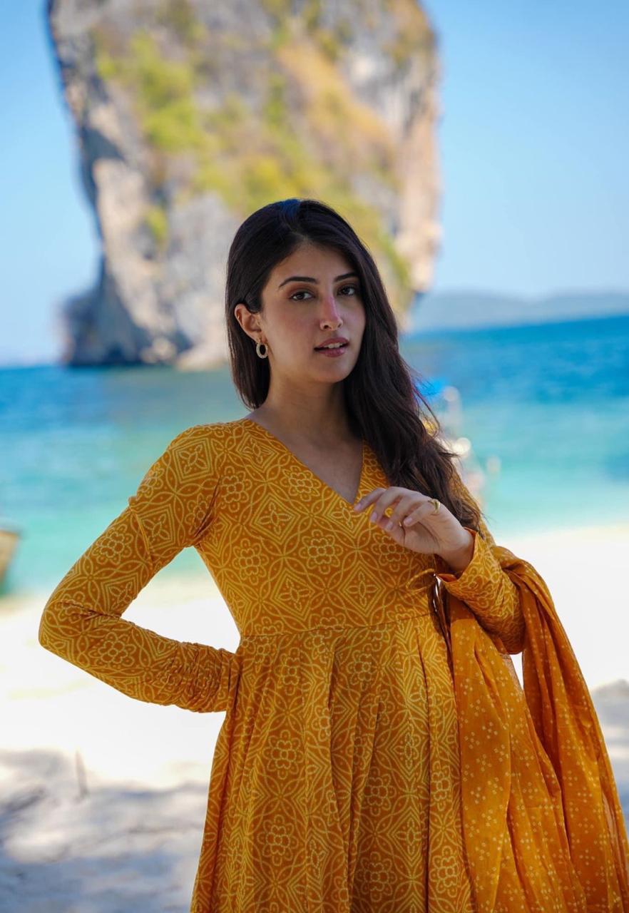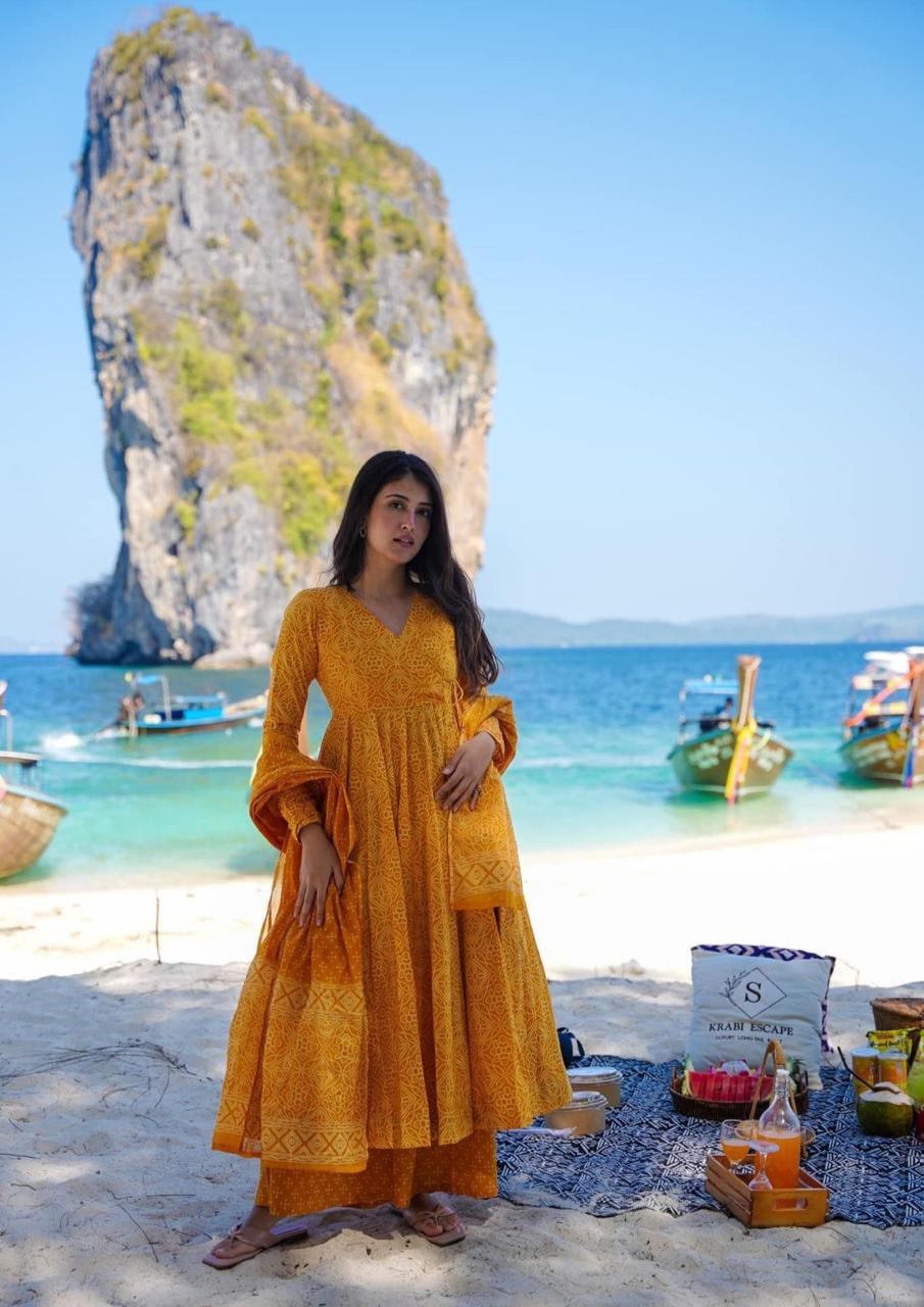 This beautiful Bandej Design Anarkali Angrakha Dress is made from soft and breathable cotton fabric. It features a stunning Bandej print, a flattering Anarkali silhouette, and delicate tussles. The dress comes with a palazzo pant and a matching cotton dupatta. This versatile outfit is perfect for parties, festive occasions, and everyday wear.