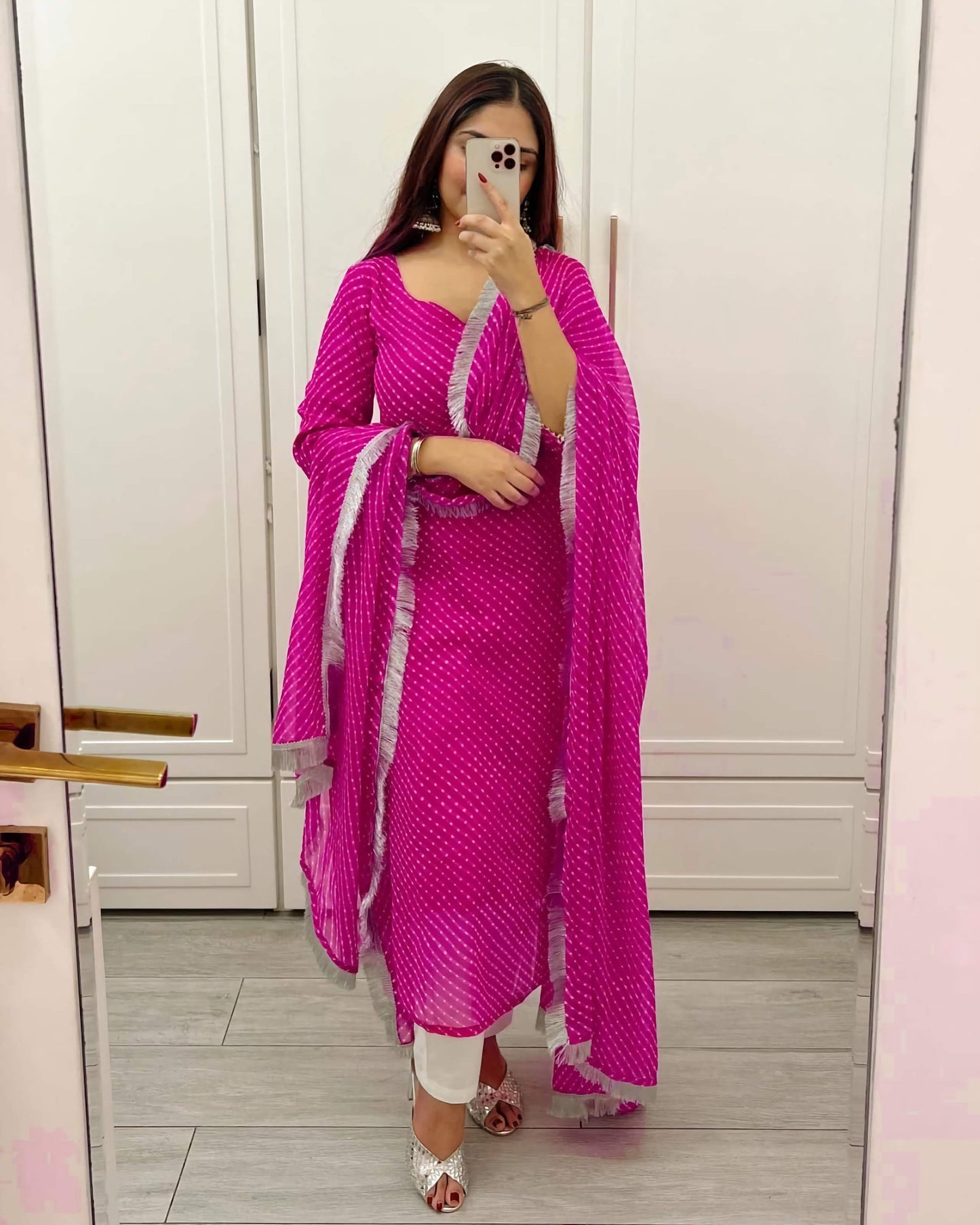 - Elegant Design: Features a captivating Lahariya print on the georgette kurti.