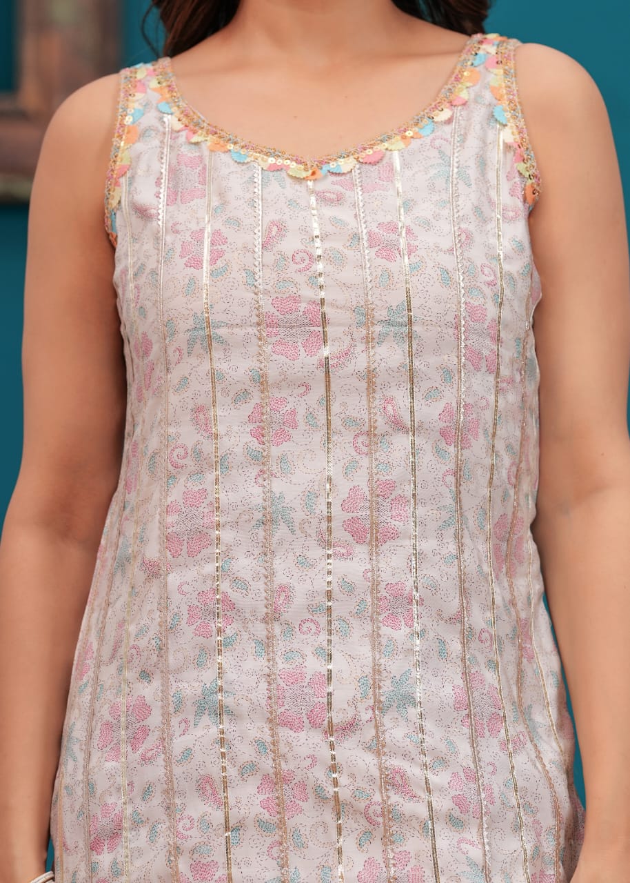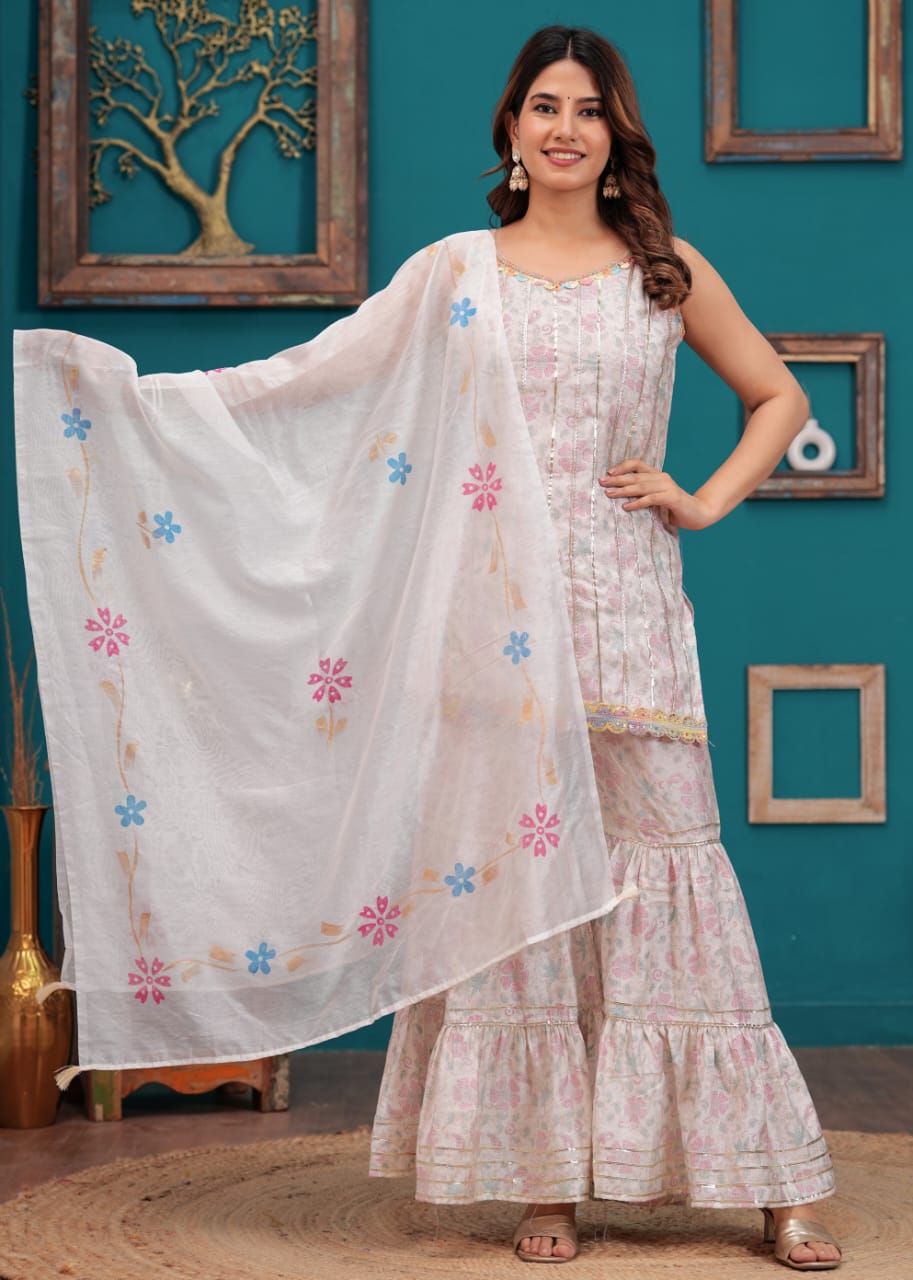 Muslin Short Kurti with Sharara & Chanderi Dupatta Set - Digital Foil Print