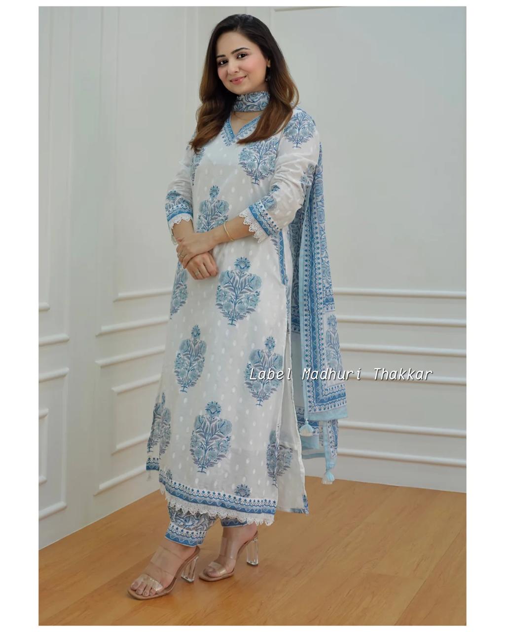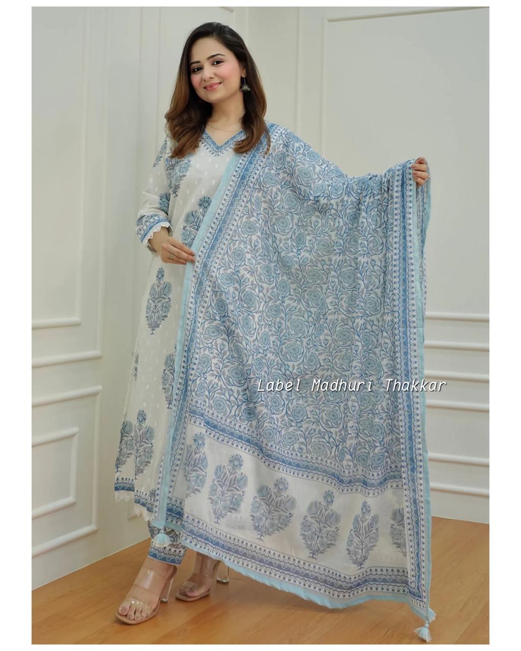 To complete the look, the set includes matching Afghani pants that perfectly complement the top, enhancing its overall allure. The lightweight and soft cotton dupatta adds a touch of elegance, draping gracefully over your shoulders.
