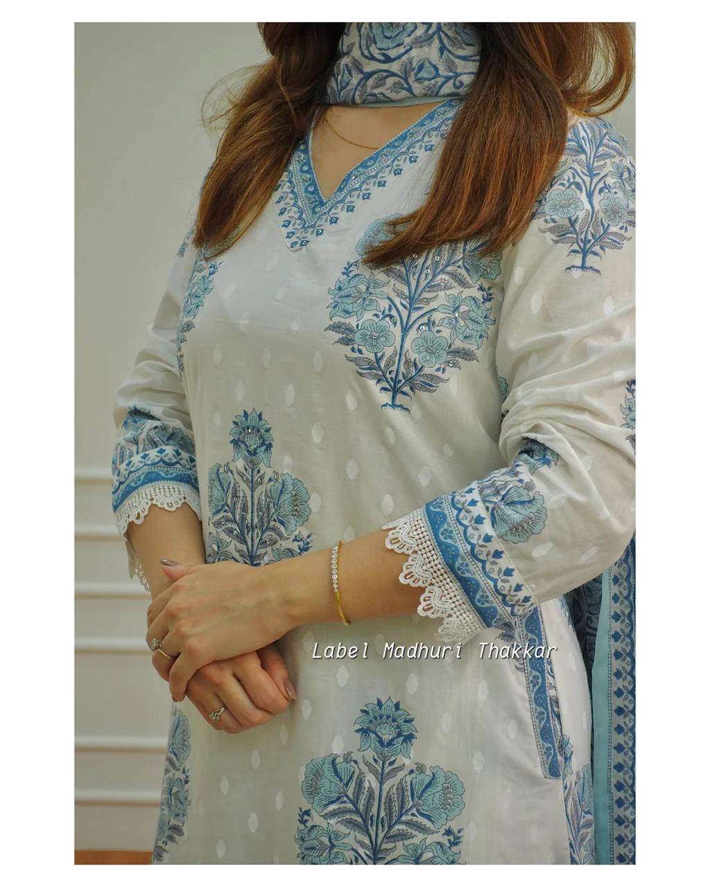 Indulge in the mesmerizing beauty of our "Elegance in Bloom" Afghani suit set. This exquisite ensemble features a stunning white-grey floral design adorned with intricate handwork, side pockets, and charming motifs. Crafted with utmost care and attention to detail, this suit set is the epitome of grace and sophistication.