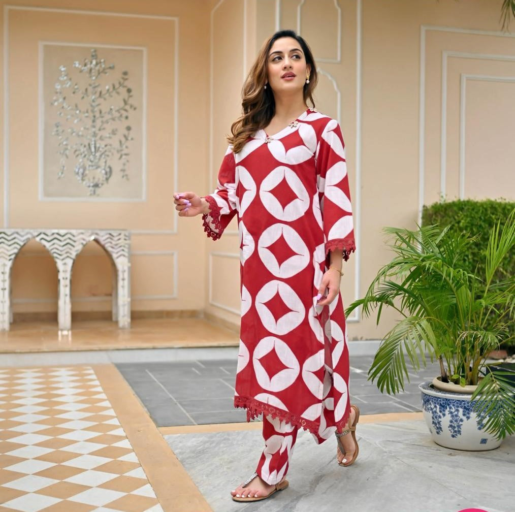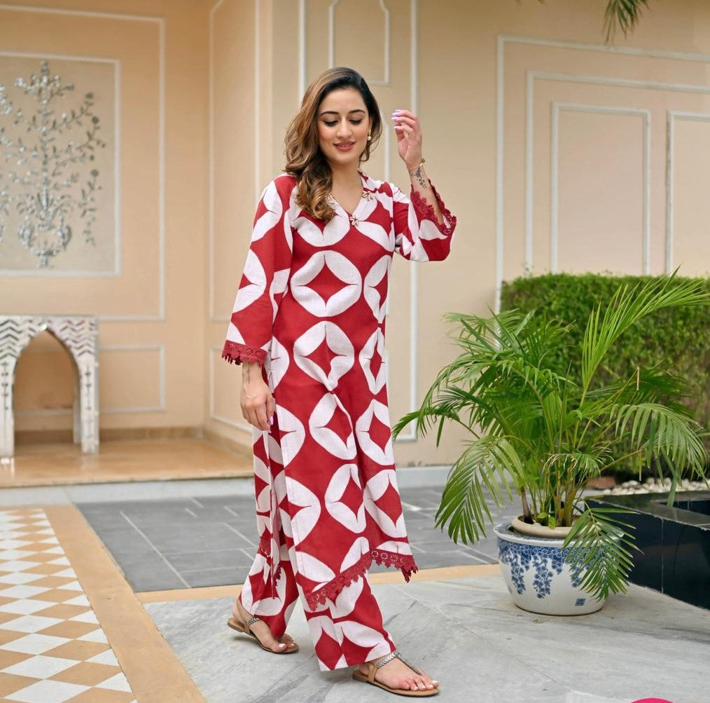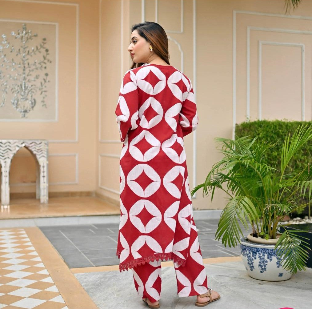 Don this stunning ensemble, and let it speak volumes about your refined taste and appreciation for quality craftsmanship. Upgrade your ethnic collection with our Cotton Printed Kurta Cord Set with Chicken Lace, and experience the perfect fusion of comfort and style.