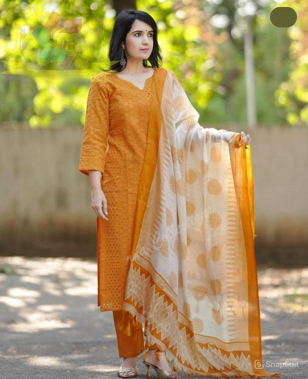 Add timeless charm to your ethnic collection with this beautifully crafted Schiffli embroidery kurti set. Designed for festive elegance and everyday comfort, this set includes a cotton kurti with delicate Schiffli work, soft cotton pant, and a rich silk dupatta – perfect for celebrations, gatherings, or festive occasions.