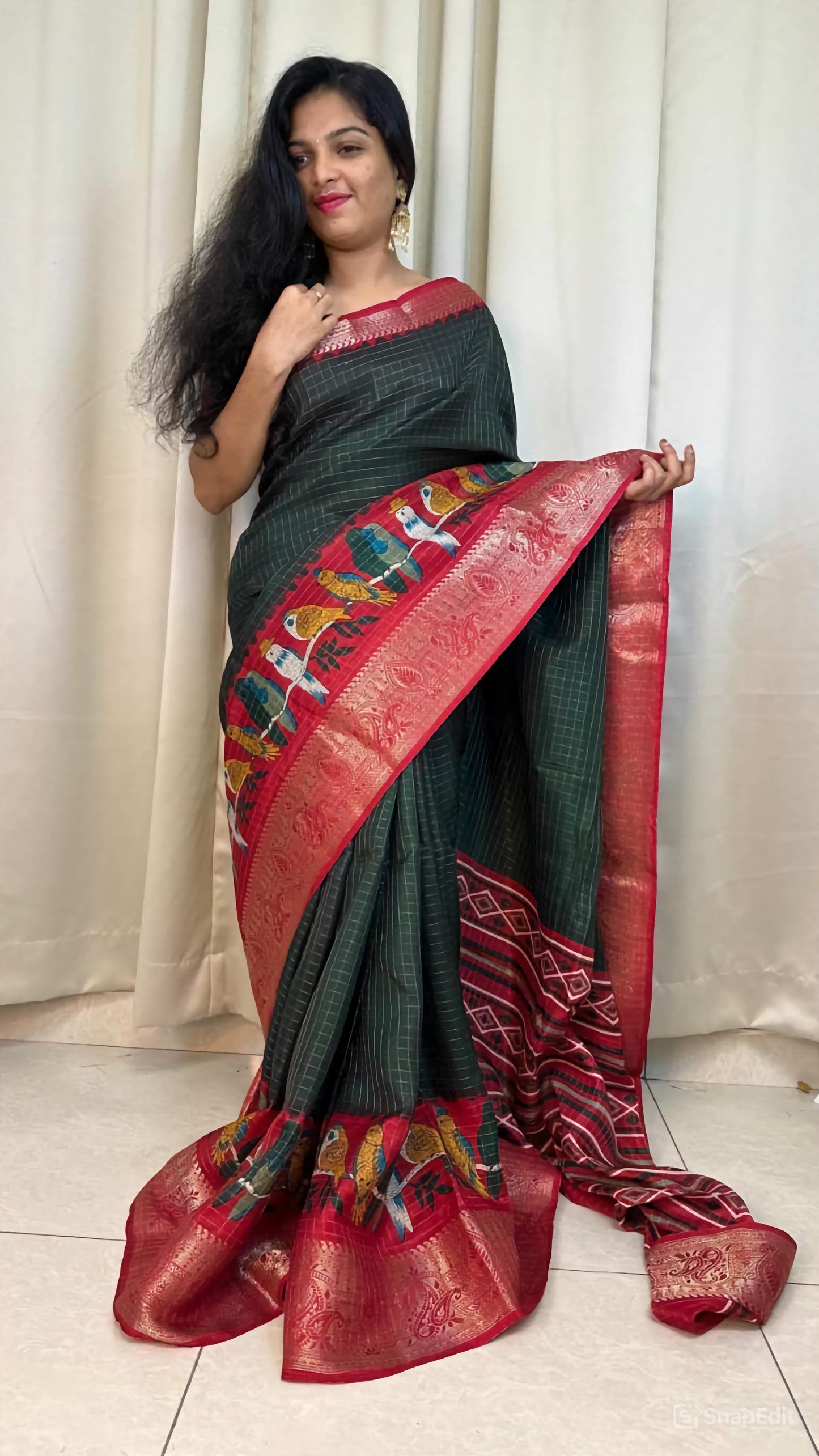 - Striking Jari Chex Design: The intricate jari chex pattern adds a touch of sophistication and tradition to the saree.