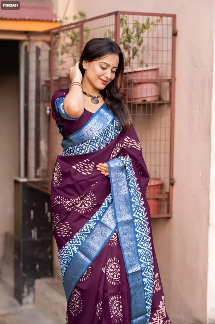 Elevate your ethnic wardrobe with this exquisite cotton silk batik print saree featuring a stunning jacquard Kanjivaram zari border and pallu. Designed for both comfort and elegance, this saree is perfect for festive occasions, weddings, and special celebrations.