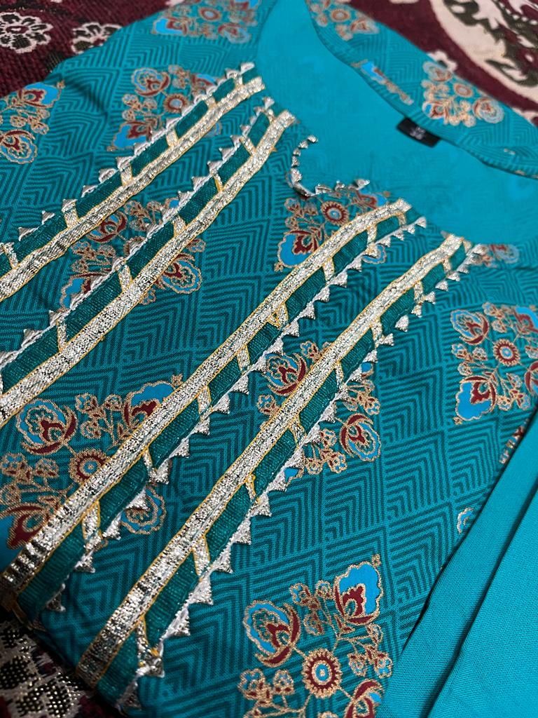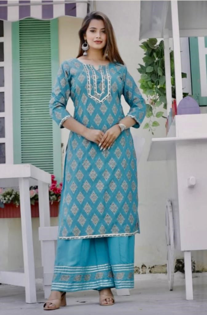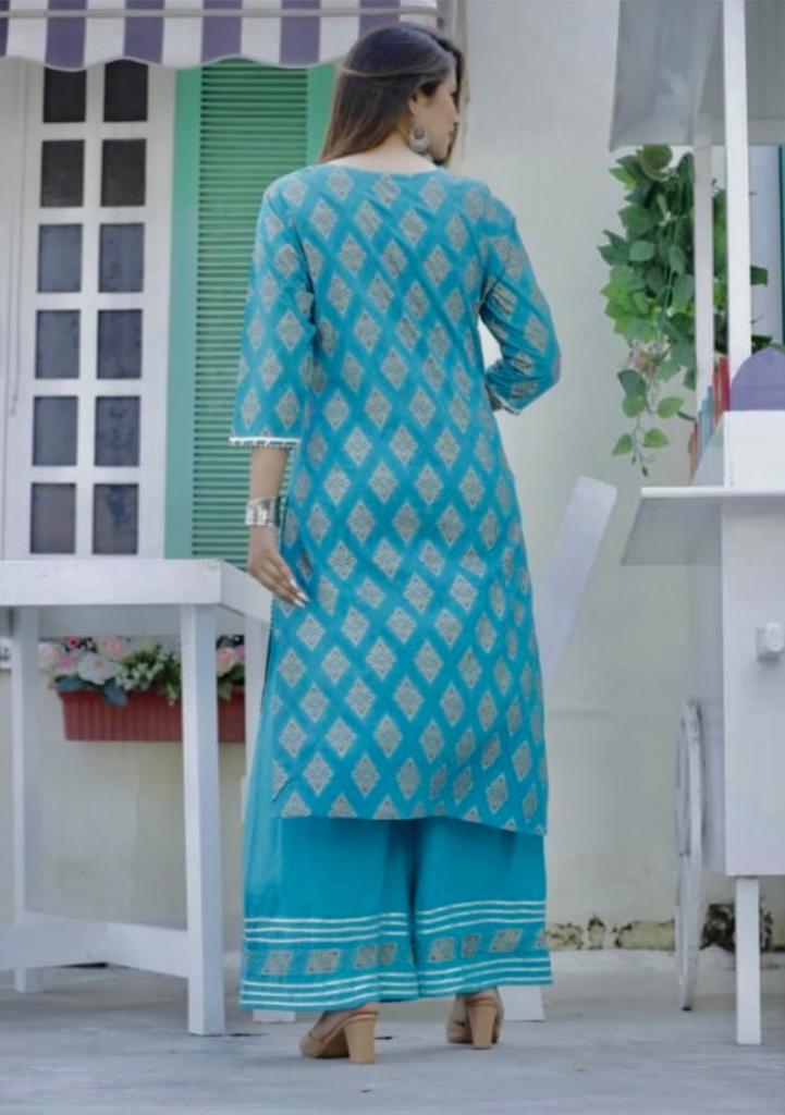Add a touch of elegance and sophistication to your wardrobe with our exclusive Rama Blue Printed Kurti Set with Gota Lace and Sharara. Shop now and embrace the enchanting allure of this unique ensemble.