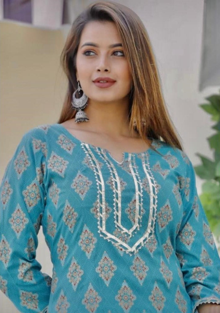 Ethereal Elegance: Rama Blue Printed Kurti Set with Gota Lace and Sharara