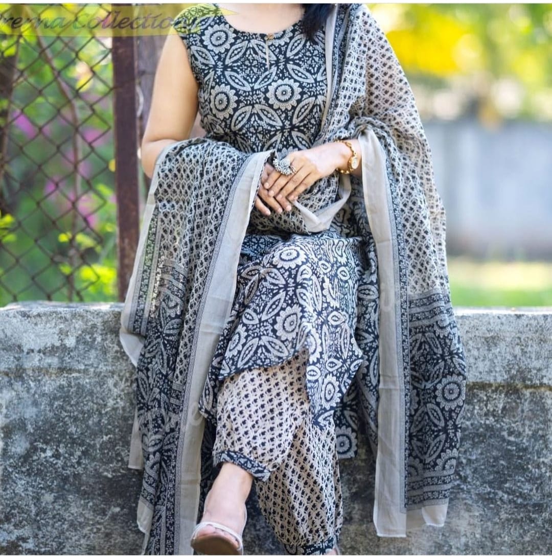 Step into a world of timeless elegance with our exquisite Sanganeri Block Print Straight Kurta Set in Black. Crafted from the finest cotton material, this ensemble showcases the artistry of Sanganer, renowned for its intricate block printing techniques. The black color lends a touch of sophistication, making it a versatile addition to your wardrobe.