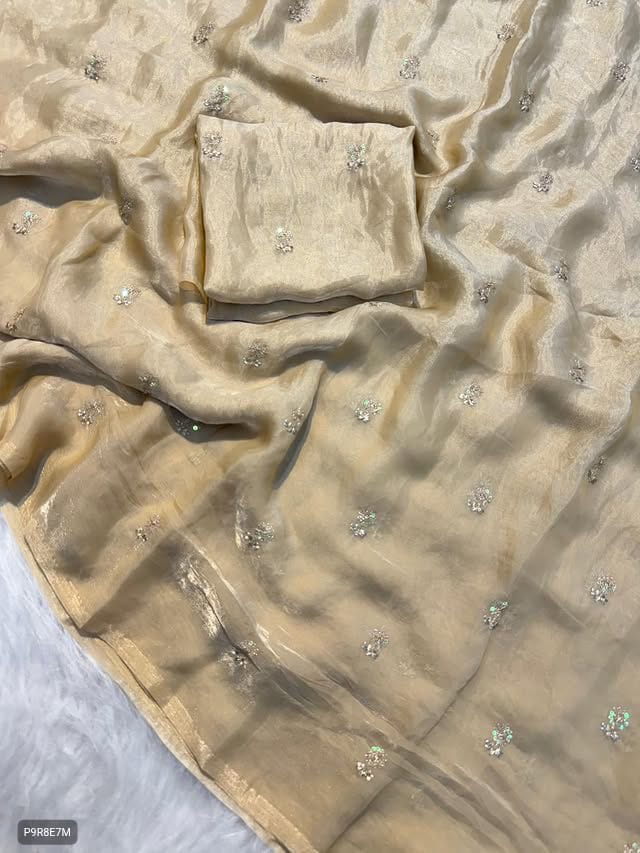 Celebrate the elegance of Onam with this exquisite Fendy Satin Saree featuring a dual-shaded finish adorned with intricate zari and sequin flower butti work. Perfectly paired with a contrast blouse enhanced with delicate detailing, this saree brings tradition and modern charm together for your festive look.
