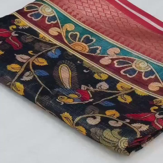 Elevate your ethnic wardrobe with this elegant Kota Pattu Saree featuring intricate Kalamkari digital prints and a luxurious contrast weaving pattu border. Crafted in a lightweight kota blend, this saree is ideal for festive occasions, weddings, or graceful everyday wear. Paired with a digital print running blouse enhanced with zari, it strikes the perfect balance between tradition and modern style.