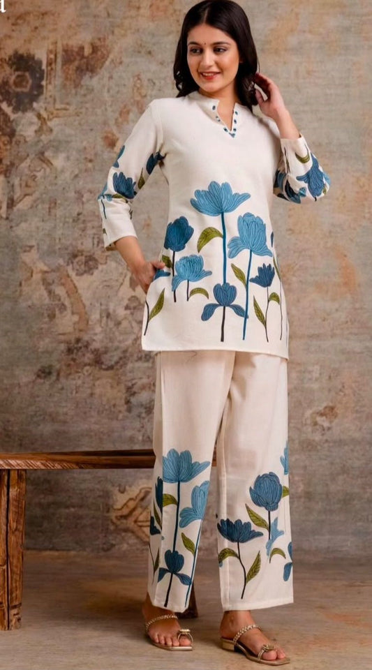 Cotton Slub Embroidered Kurti Pant Cord Set with Adda Beads Work