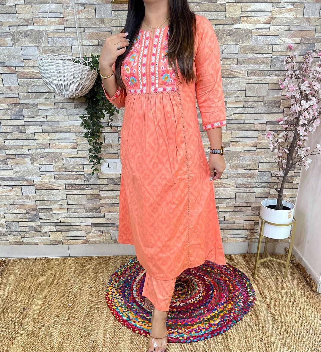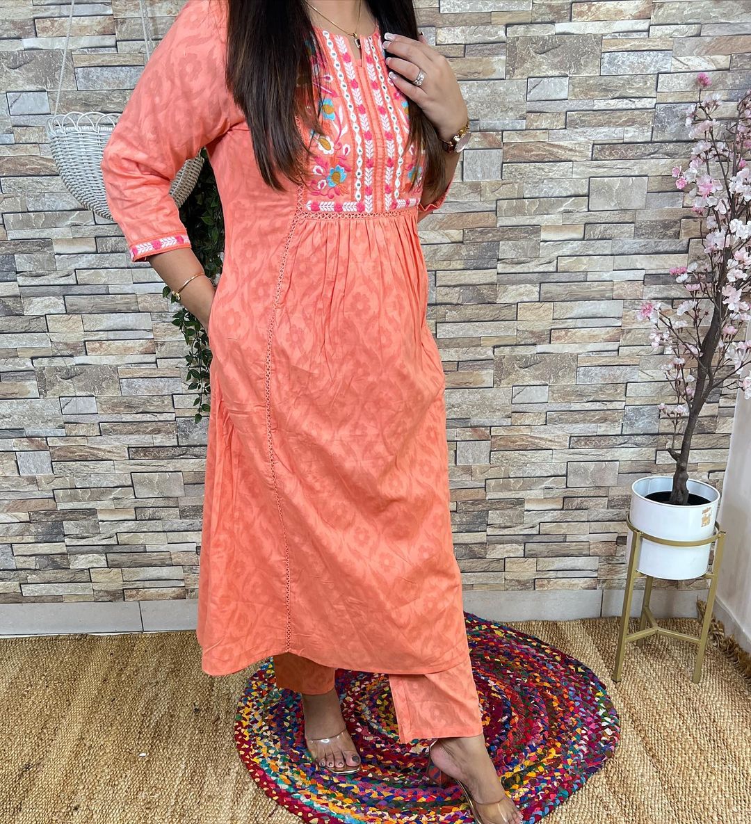 Crafted from high-quality cotton fabric, this set promises a soft touch against your skin, ensuring comfort throughout the day. The intricate machine embroidery adds a touch of timeless charm, creating an ensemble that effortlessly transitions from casual gatherings to festive occasions.