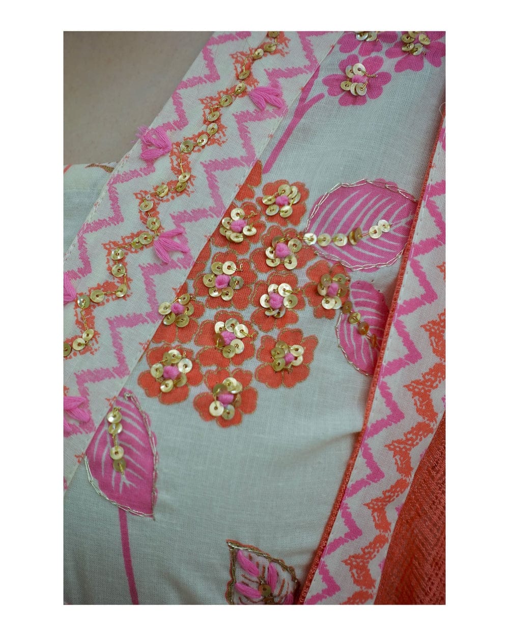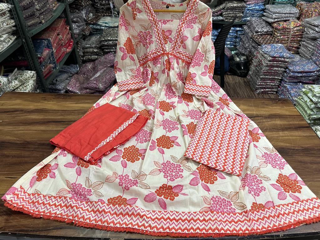 Indulge in the allure of floral motifs, the grace of an Anarkali silhouette, and the comfort of premium cotton. Elevate your style with this exquisite suit set that effortlessly combines tradition and fashion. Order now and bloom with confidence!