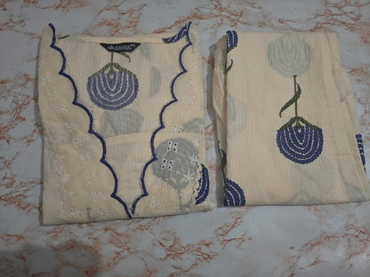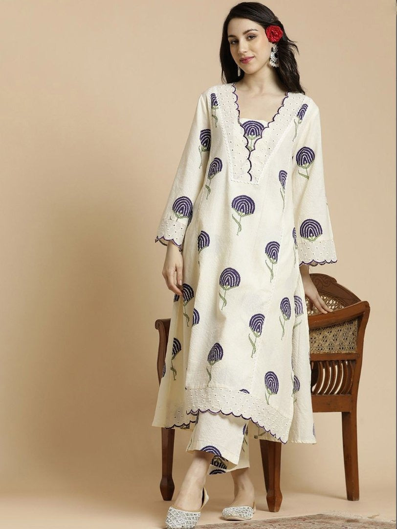 Experience the perfect blend of style and comfort with this stunning blue cotton kurta and palazzo set. The beautiful floral print and delicate embroidery add a touch of elegance, while the bell sleeves and comfortable COTTON KATHA fabric ensure all-day ease. The kurta's A-line pattern and square neckline create a flattering silhouette.