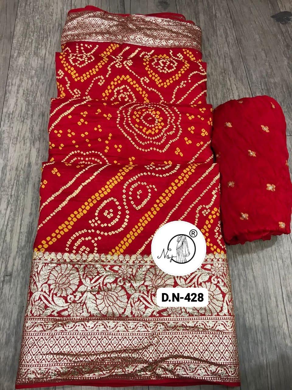 Introducing our exquisite Bandhani saree, a true masterpiece that beautifully blends traditional Indian craftsmanship with the allure of Russian fabrics and opulent zari work. This resplendent saree is a testament to the fusion of cultures and styles, making it a must-have for your wardrobe.