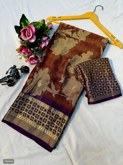 Embrace timeless elegance with our stunning Floral Brasso Saree. This exquisite saree features a delicate floral print on a lightweight and lustrous brasso fabric, creating a beautiful interplay of sheer and opaque textures. The intricate design lends a touch of sophistication, making it a perfect choice for festive occasions, parties, and evening soirees.