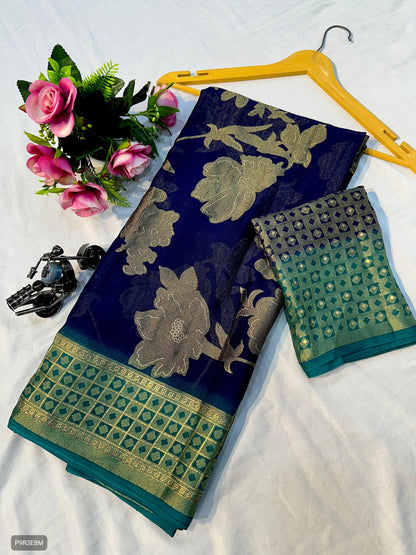 Embrace timeless elegance with our stunning Floral Brasso Saree. This exquisite saree features a delicate floral print on a lightweight and lustrous brasso fabric, creating a beautiful interplay of sheer and opaque textures. The intricate design lends a touch of sophistication, making it a perfect choice for festive occasions, parties, and evening soirees.