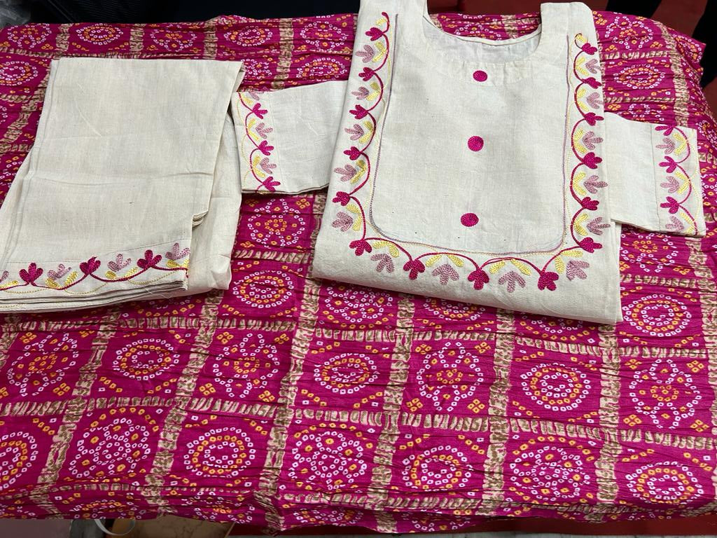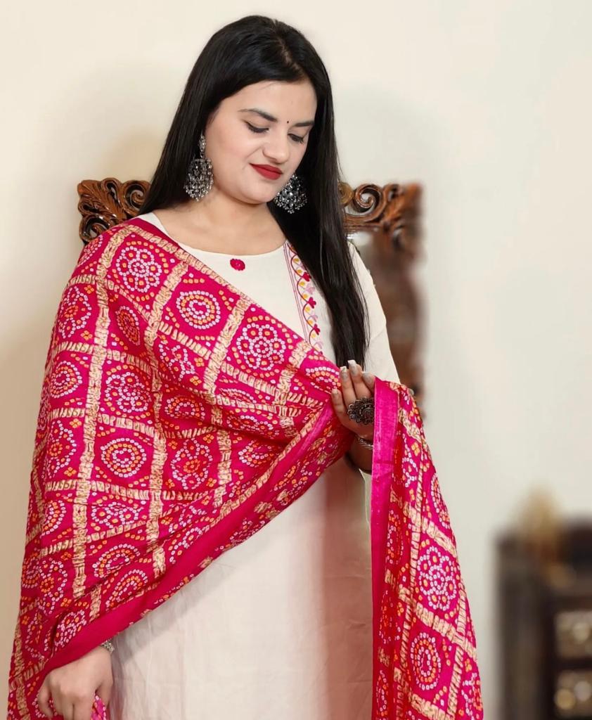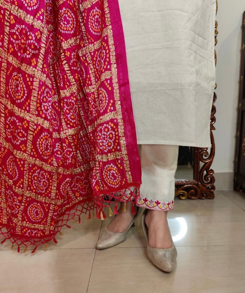 Hand-Embroidered Creamy White A-Line Kurta with Pants and Bandhej Printed Dupatta