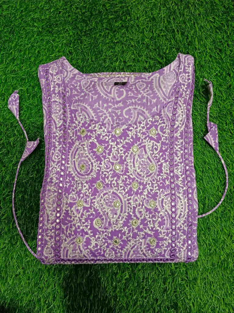 Made from premium cotton 60*60 fabric, this gown offers a delightful blend of comfort and elegance. The vibrant purple hue radiates sophistication and stands out beautifully against any backdrop. The Samosa lace delicately adorns the border, enhancing the gown's allure with its graceful presence. Additionally, the gota lace detailing further elevates its charm, perfectly accentuating the gown's six kali big flare design.