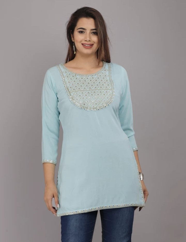 Embrace a touch of ethereal charm with our Sky Blue Embroidered Top. This enchanting garment combines intricate embroidery with modern design elements, resulting in a captivating piece that will elevate your wardrobe to new heights. The soft, sky-blue hue adds a refreshing touch, reminiscent of clear summer skies. The side cut adds a hint of allure, while the half sleeves strike the perfect balance between elegance and comfort. Crafted with meticulous attention to detail, this top is a testament to both style and quality. Whether paired with jeans for a casual day out or dressed up with a skirt for a special occasion, this sky-blue embroidered top is sure to turn heads and make a lasting impression.