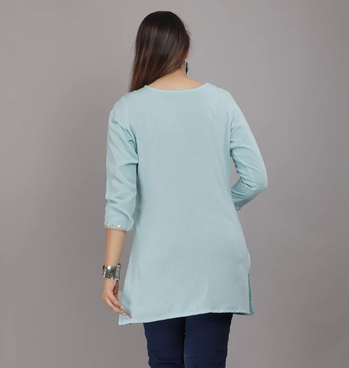 Sky Blue Embroidered Top with Side Cut and Half Sleeves