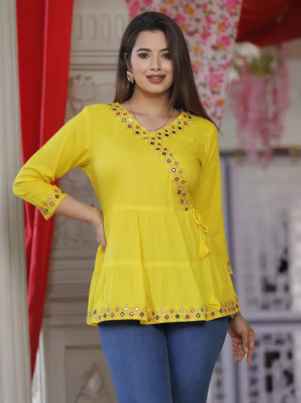 Whether you pair it with jeans for a casual outing or dress it up with a skirt for a special occasion, this yellow rayon top is sure to make a statement. It effortlessly combines style and comfort, making it a versatile addition to your wardrobe.