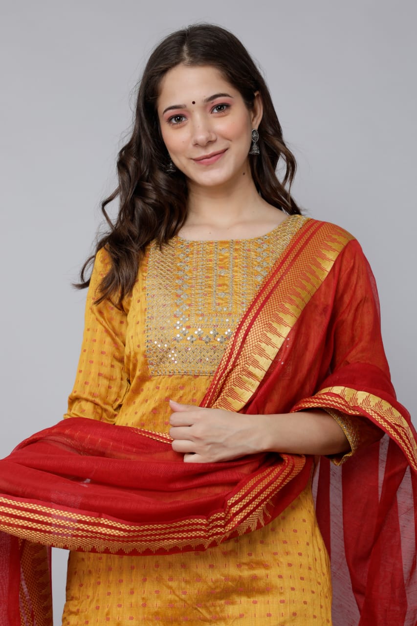 Elevate your ethnic wardrobe with this stunning 3-piece Kurti Set, meticulously crafted with intricate handwork and embroidery on the yoke. Made from high-quality Machali fabric, this fully stitched ensemble showcases a perfect blend of traditional and contemporary design elements. The fabric is printed with an eye-catching pattern, adding a touch of vibrancy to your attire.