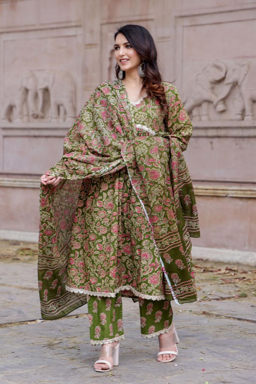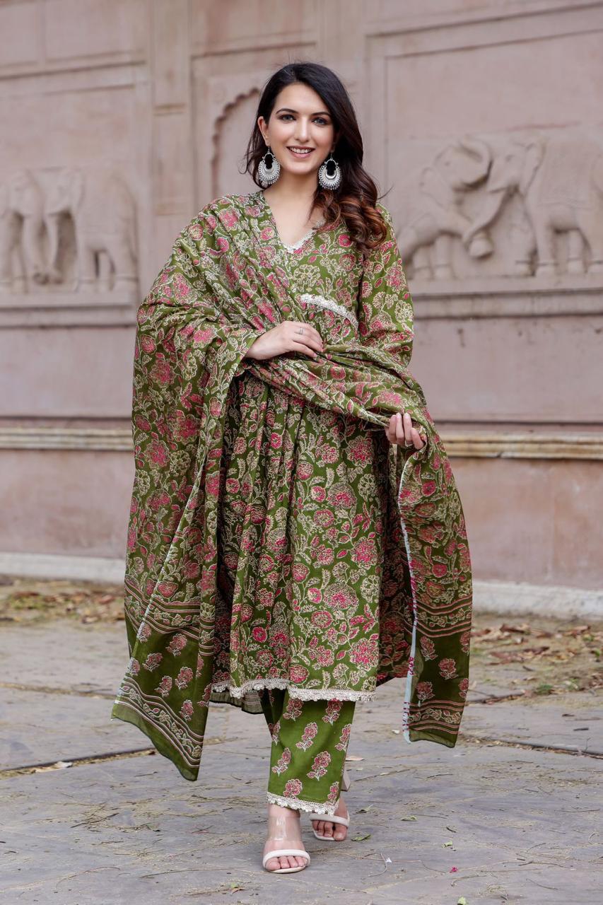 Step into a world of timeless elegance with our exquisite Green Cotton Alia Cut Anarkali Kurti Set. Crafted from high-quality cotton fabric with a 60x60 thread count, this stunning ensemble offers both comfort and style. The set includes a fully stitched Kurti, Pant, and Dupatta, making it a complete outfit for any occasion.