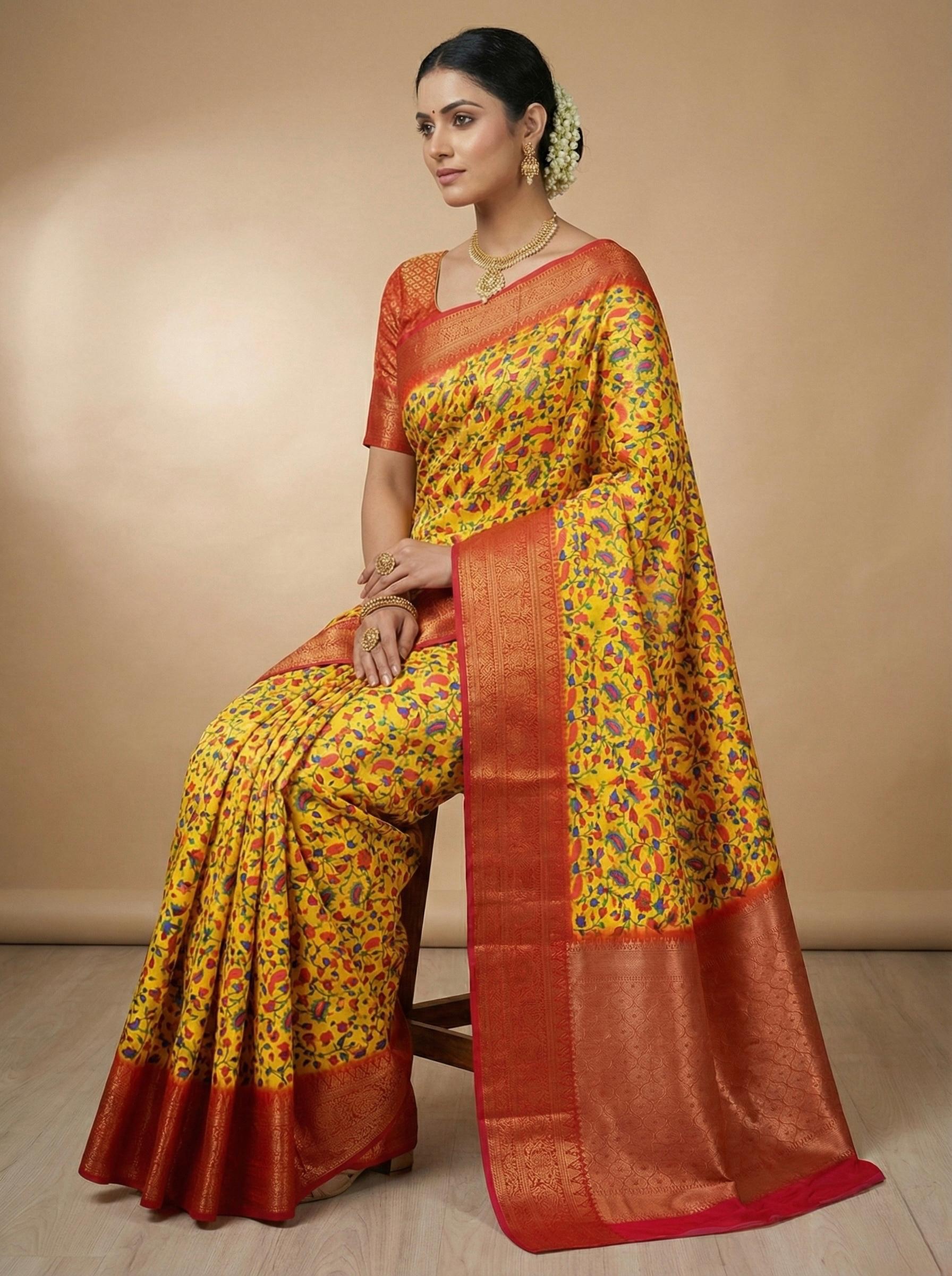 Banarasi Silk Pichwai Kalamkari Saree with Zari Gold Kanchi Weaving