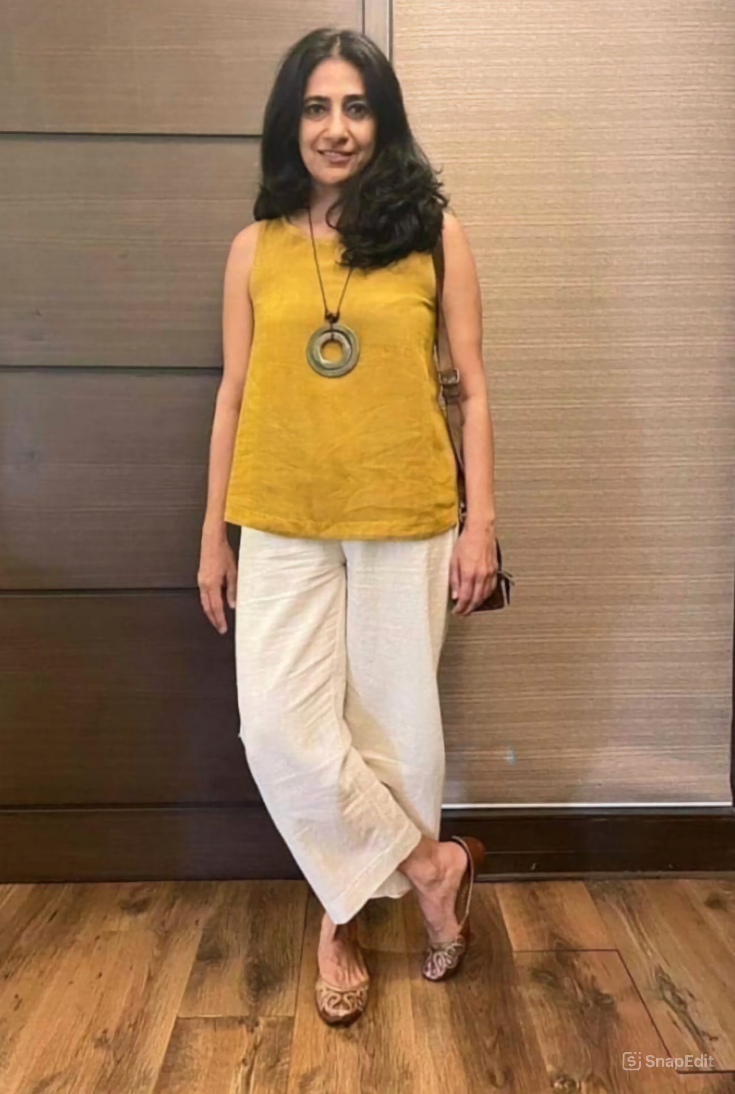 • Bottom: The cotton slub palazzo pant with 38-inch length, offers a breezy and comfortable feel, perfect for warmer weather.