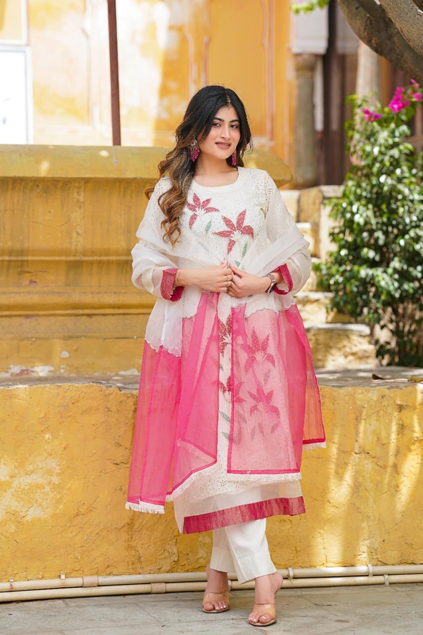 Cotton Shifley A-Line Kurta Set with Lining, Pant & Organza Dupatta