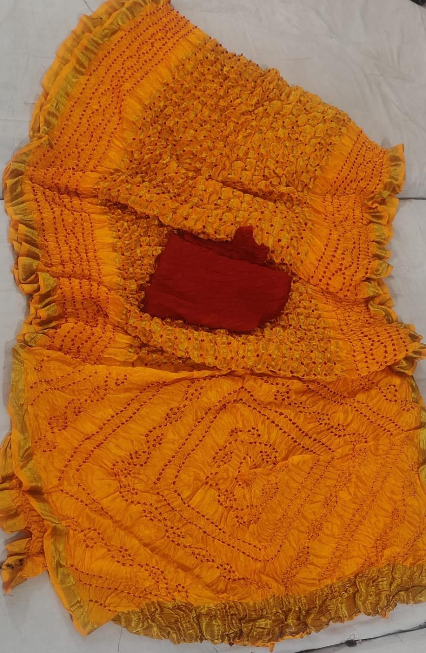Make a style statement with this timeless masterpiece that celebrates Indian craftsmanship. Add this elegant Bandhej Ghadchola silk saree to your collection today!
